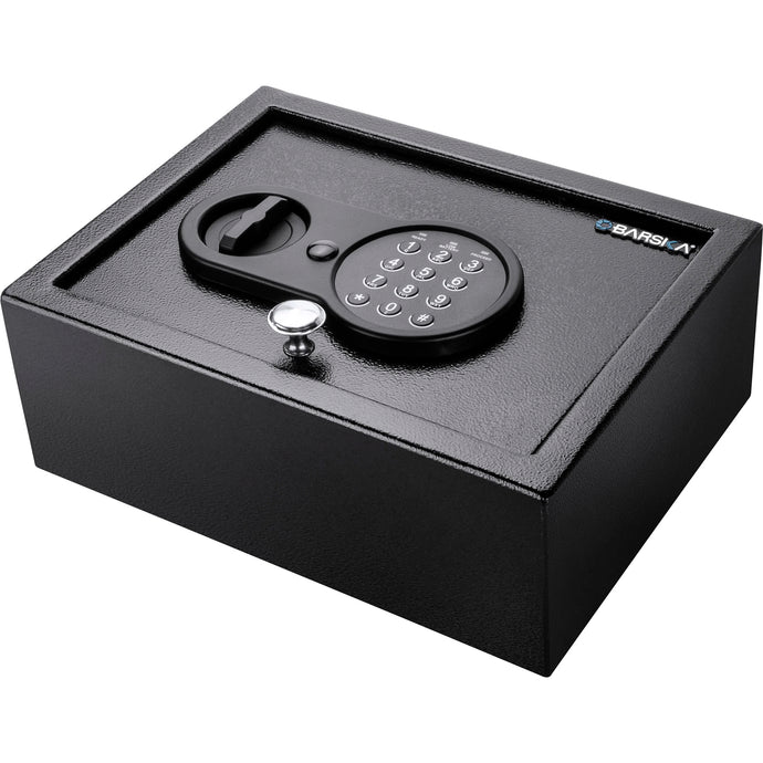 Keep valuables safe and secure with the 0.15 Cu. ft Top Opening Keypad Security Safe by Barska. The spacious dimensions of this safe makes it perfect for storing multiple valuables, such as medicine, money, jewelry, and electronics. The user-friendly digital keypad retains 1 PIN Code for accessing the safe, and can also be opened with the included back-up keys. Two solid steel locking bolts provide extra security against tampering, and 4 mounting holes allow the safe to be secured to a flat surface.