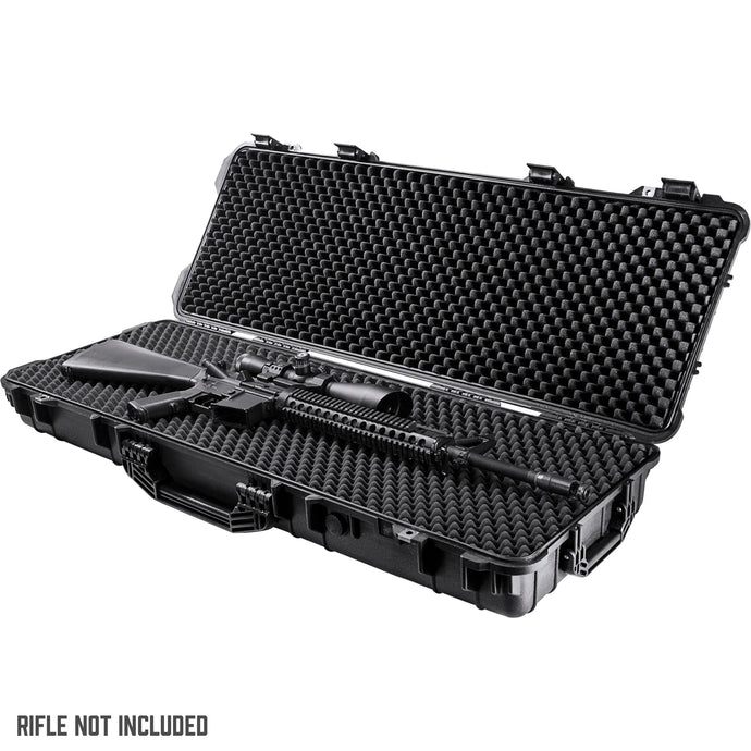 Ensure your rifle is protected from the elements with the AX-600 Watertight 44" Hard Rifle Case with Wheels by Loaded Gear. The AX-600 can protect rifles securely in a fully customizable cubed foam interior. The extra-tough polypropylene casing offers crushproof protection for your rifle, and also prevents your rifle and ammo from being exposed to moisture with a water-tight seal. Customize the cubed foam padding to better secure and protect your rifle and your accessories. Additional security is provided with the cases four solid locking latches and two reinforced locking points. Backed by Barska's 1 Year Limited Warranty.