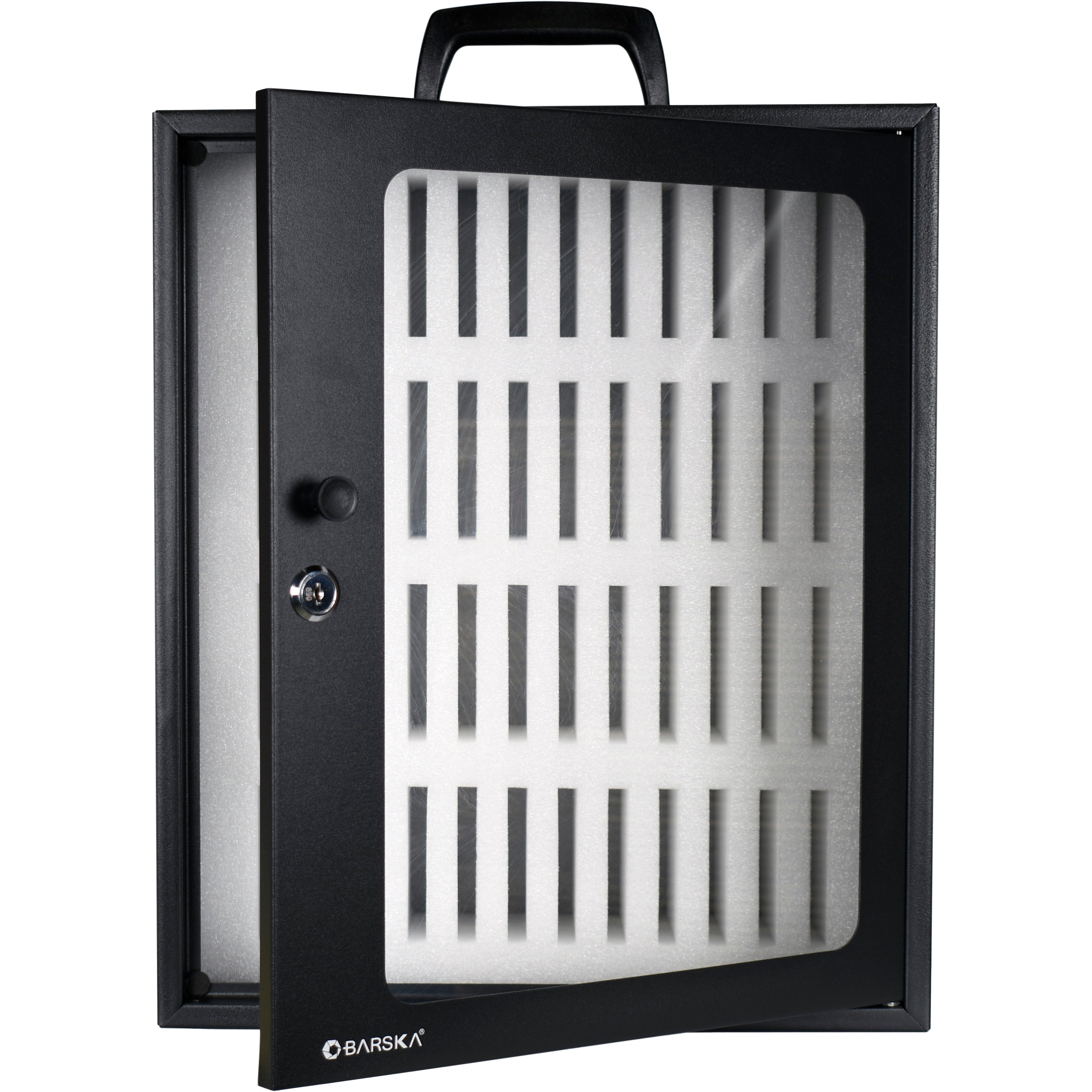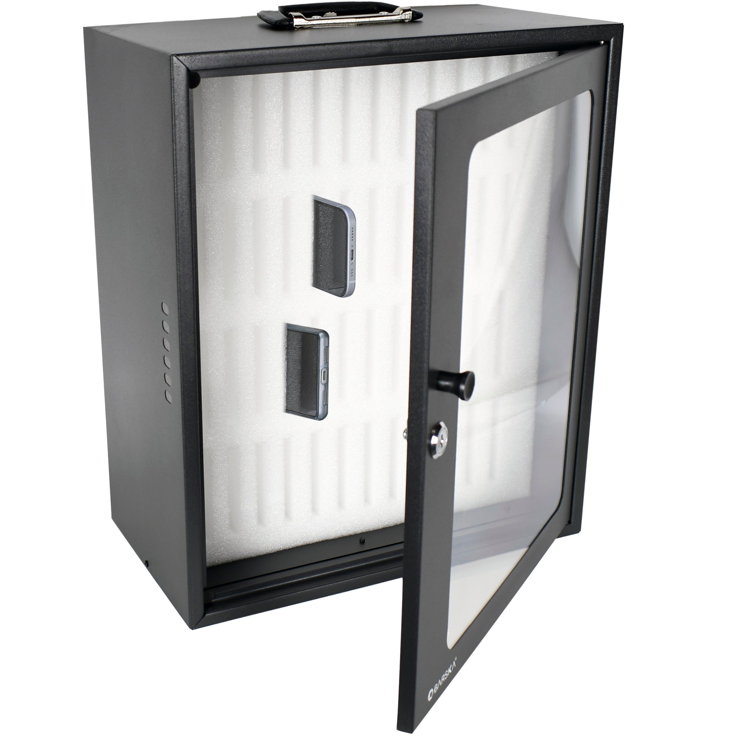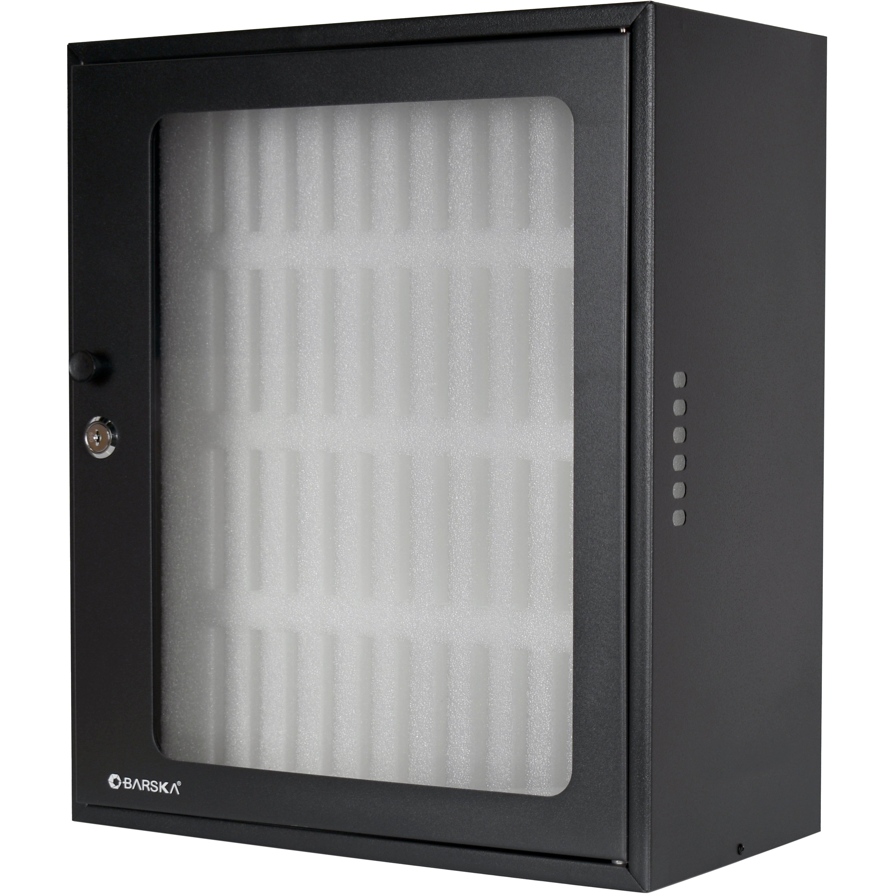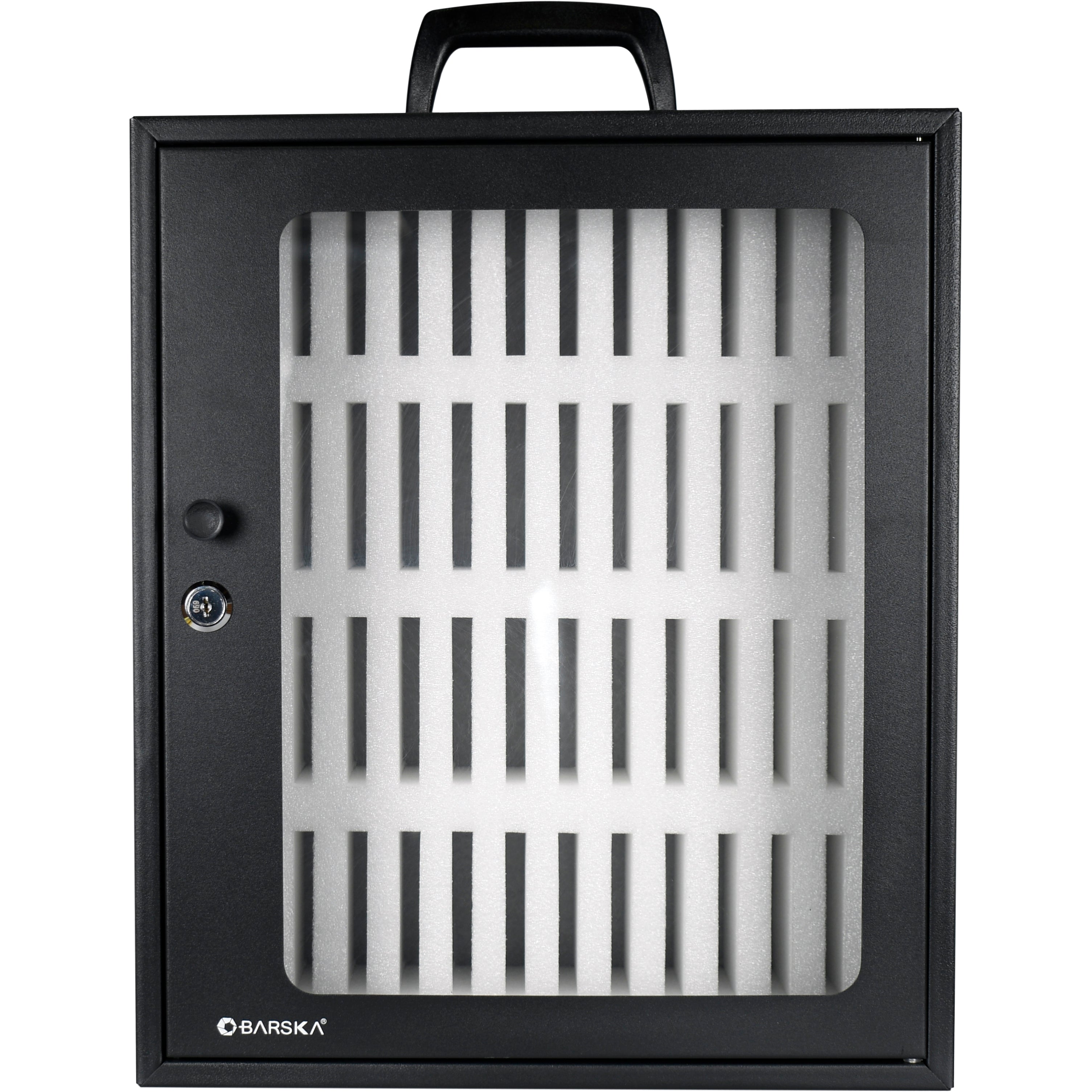Maximize your workspace efficiency and device security with the 48 Capacity Smartphone (Cell Phone) Lock Box with Key Lock & Carry Handle by Barska. This versatile cabinet features 48 individual padded & numbered slots cut from rigid protective foam, each designed to securely hold smartphones (cell phones). Perfect for classrooms, offices, or any shared space, this cabinet helps keep track of smartphones (cell phones) while also preventing theft, damage, and clutter. The cabinet’s compact design allows for easy placement on desks or shelves, and its sturdy construction ensures long-lasting use. The port holes on either side allow for smartphones (cell phones) to be charged while stored. The Lock Box is equipped with pre-drilled mounting holes as well as a convenient carry handle for easy portability, making it ideal for transporting between locations or mounting securely in place on a wall.