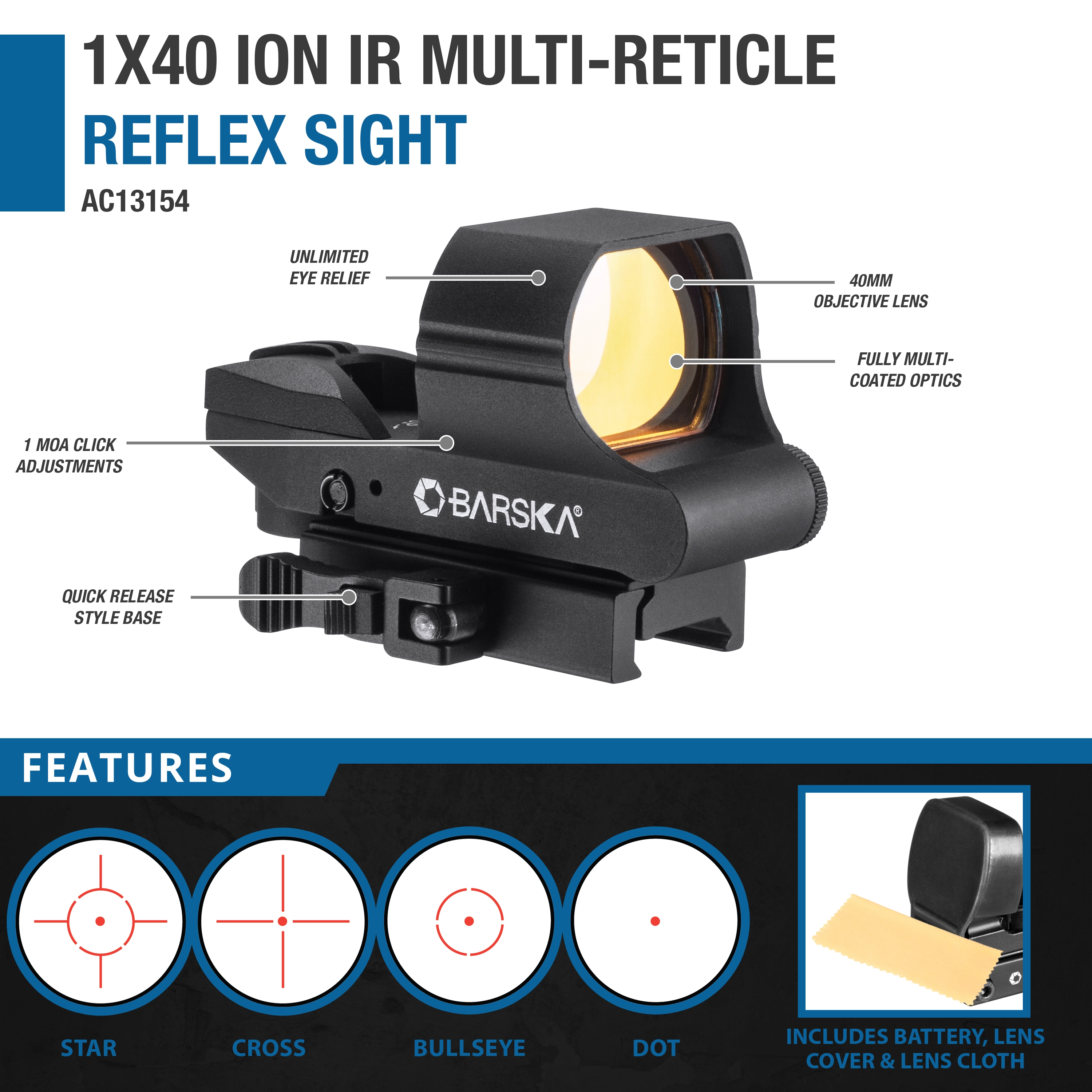 Experience targeting versatility with the 1x40 ION Reflex Sight from Barska. Four unique reticle patterns allow the user to modify the sight to their own preferences, and an integrated quick-release mount allows for fast attachment and detachment to any Picatinny/Weaver-style rail.