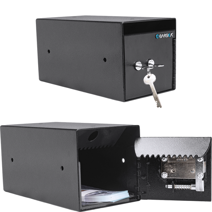 BARSKA Dual Key Depository Safes are a great way to keep cash, checks, and other important items for short periods of time while awaiting pickup. Perfect for cash drops, rent payments, important keys, paperwork, and much more. Mounting hardware and pre-drilled anchor holes for securing on the floor or counter are also included. Gas stations, restaurants, and any other retail business that deals with large volumes of cash can benefit from the security provided by BARSKA Single Key & Dual Key Depository Safes.