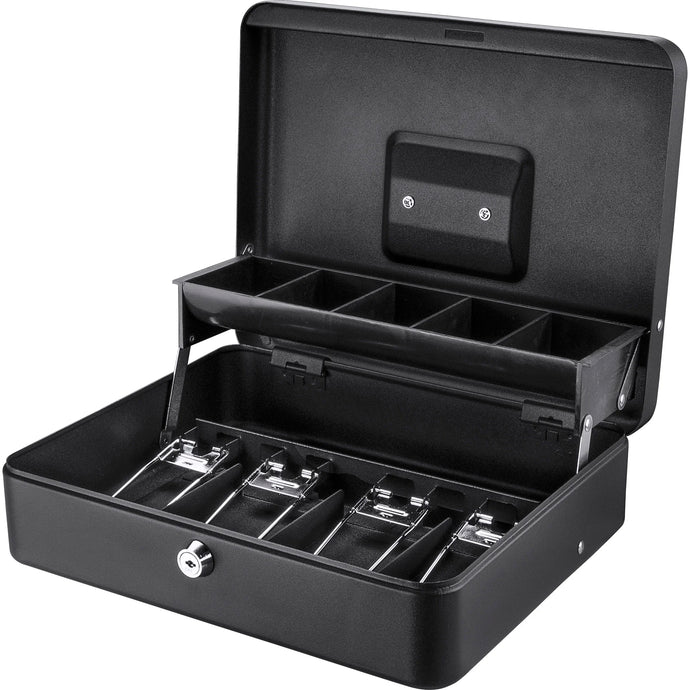 This cash box is an essential tool for mobile cash management. Constructed from tough steel for maximum security, this standard-sized cash box features internal organization trays and a separate 5-section coin tray that automatically lifts when the box is opened. This design allows for fast, organized transactions. Portability is enhanced by a folding, recessed carry handle, making it easy to store and transport. Secure your money, coins, and valuables whether you are running a business, managing an event, coordinating a fundraiser, or seeking a safe personal storage solution.