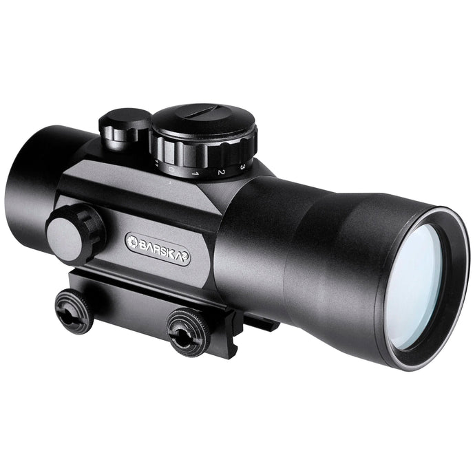The 2x30mm Red Dot 5 MOA Sight by Barska provides fast target acquisition, pinpoint accuracy and a wide field of view. This illuminated dot sight is perfect for use with rifles, handguns, shotguns, and even crossbows. The 2x30mm Dot Sight has a red 5 MOA reticle and a finger adjustable rheostat allowing variable reticle brightness control. Complete with anti-reflective coating, unlimited eye relief, and multi-coated optics, the 2x30mm 5 MOA Red Dot Scope provides optimum performance at an unbeatable price. Backed by Barska's Limited 1 Year Warranty.