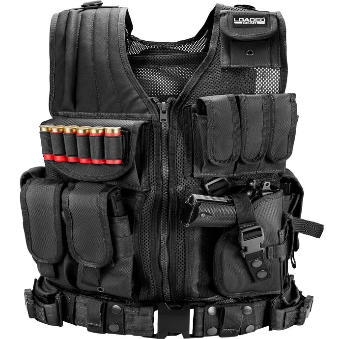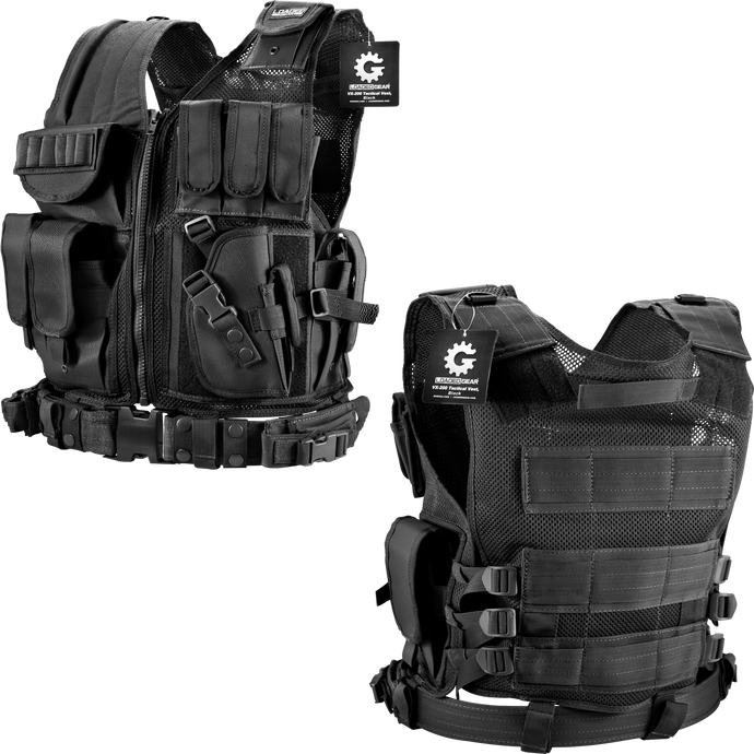 The Loaded Gear VX-200 Tactical Vest by Barska keeps ammo and tactical essentials organized and close at hand. The VX-200 is fully adjustable to fit most adults, with adjustable shoulder panels and side straps, and ladder buckles on each side of the vest allow for quicker adjustment and a customized fit. This tactical vest features four rifle mag pouches that can accommodate the standard M4/AR15 30 round magazines, and are adjustable to fit either one or two magazines per pouch. Mesh webbing designed for ventilation and durability, and the 1" heavy duty MOLLE straps allow you to carry additional gear. Front and back touch-fastener areas enable the attachment of patches and IDs. A reinforced rescue pull handle, for dragging injured personnel out of harm's way, is located on the upper back of vest.